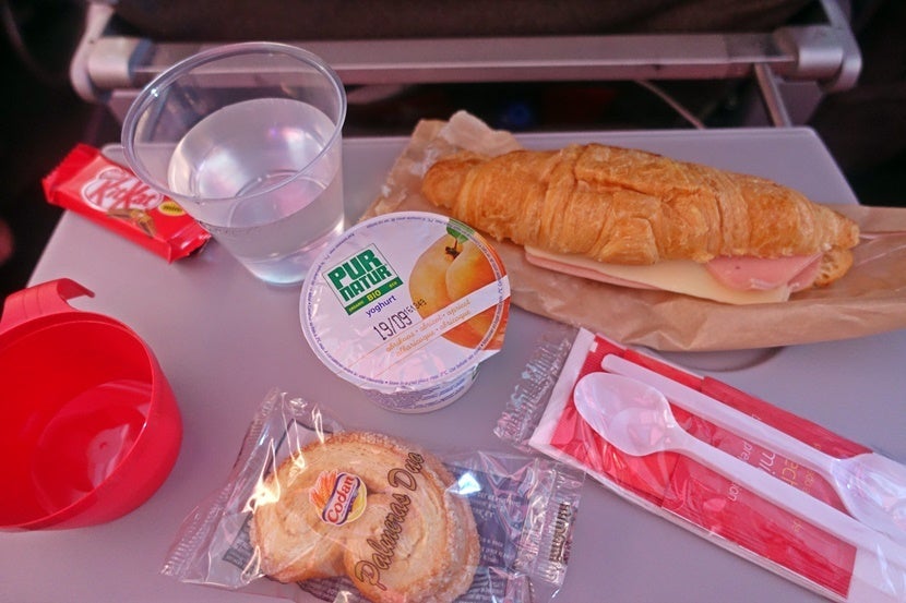 Wine and beer were available, but after all that turbulence I just wanted some water, as I was feeling dizzy from it all. Before landing, we were served a small snack: a ham and cheese croissant, yogurt, a Kit Kat bar and cookies. The croissant was fresh and delicious.