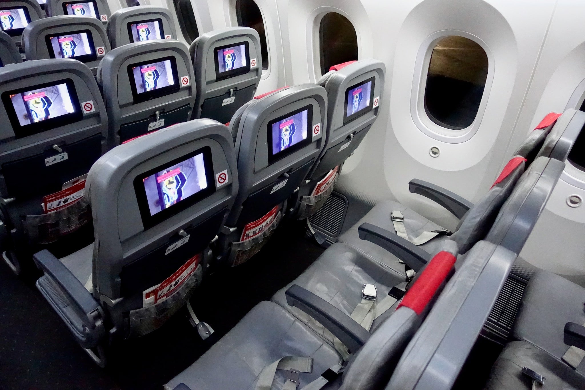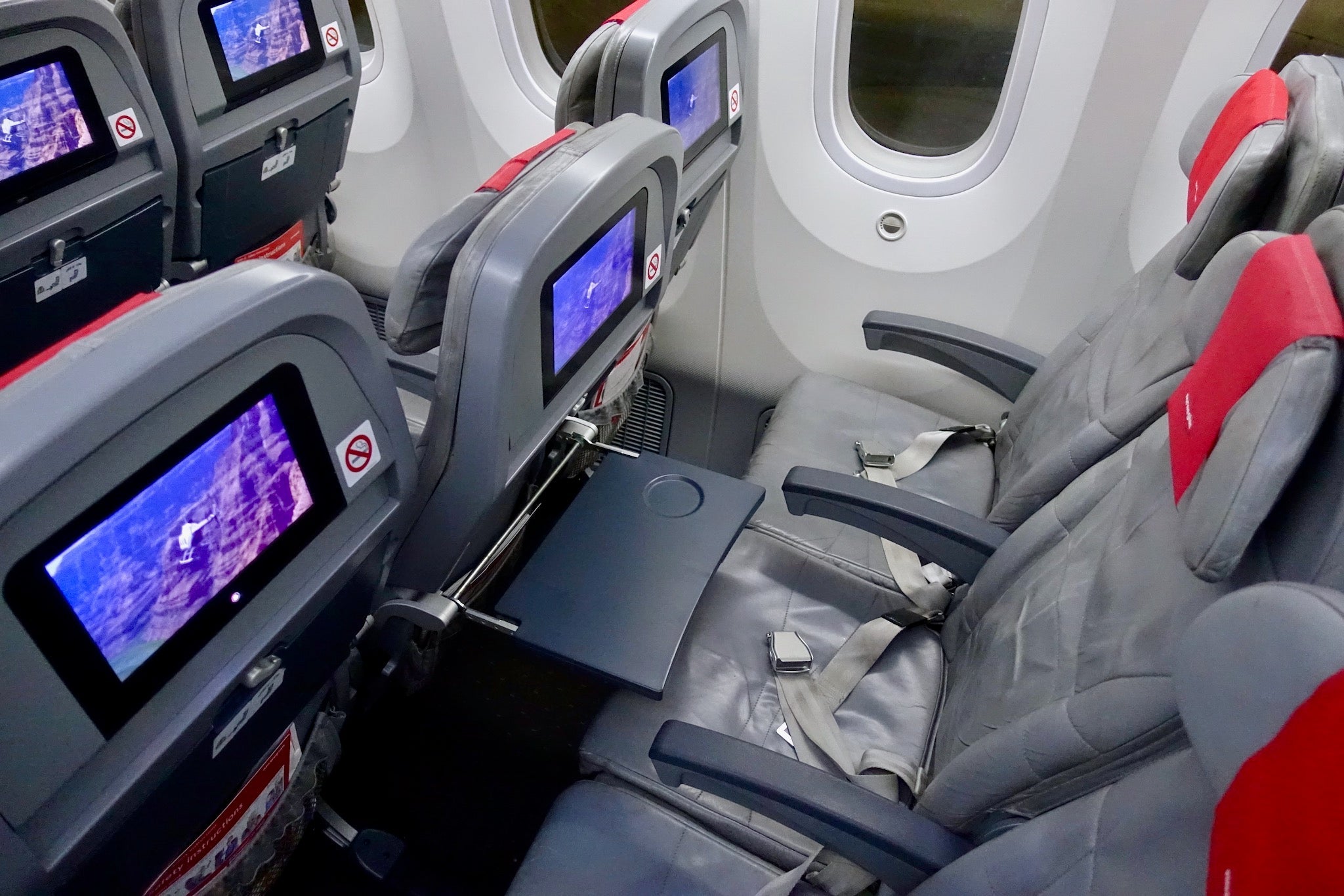 [flight_stats ticket-class="econ" review-stat-section="Cabin and Seat" tpg-rating="17" tpg-rating-max="25" configuration="3" configuration-2="3" configuration-3="3" width="17.2" pitch="31" lavs="4" live-tv="0" tailcam="0" headphones="0" comp-alcohol="0" extra-pillows="0" turndown-service="0" /]