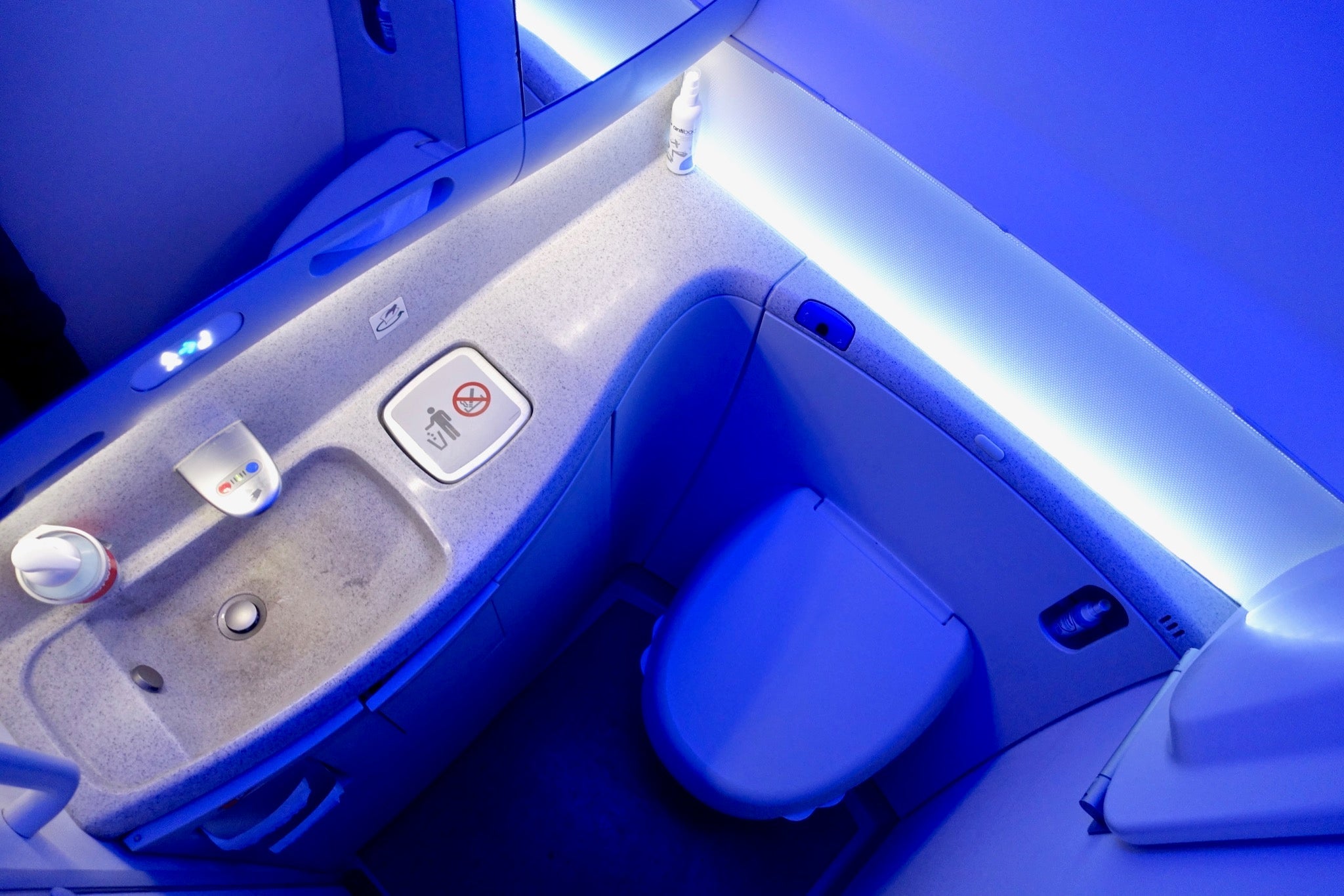 There were two lavatories separating the two economy cabins and another two in the rear of the aircraft. As is standard for the Dreamliner, there were automatic faucets and motion-activated toilets. I especially appreciated the tabs at the outer edges of the toilet seat and lid, since it meant I never had to touch the rims themselves.