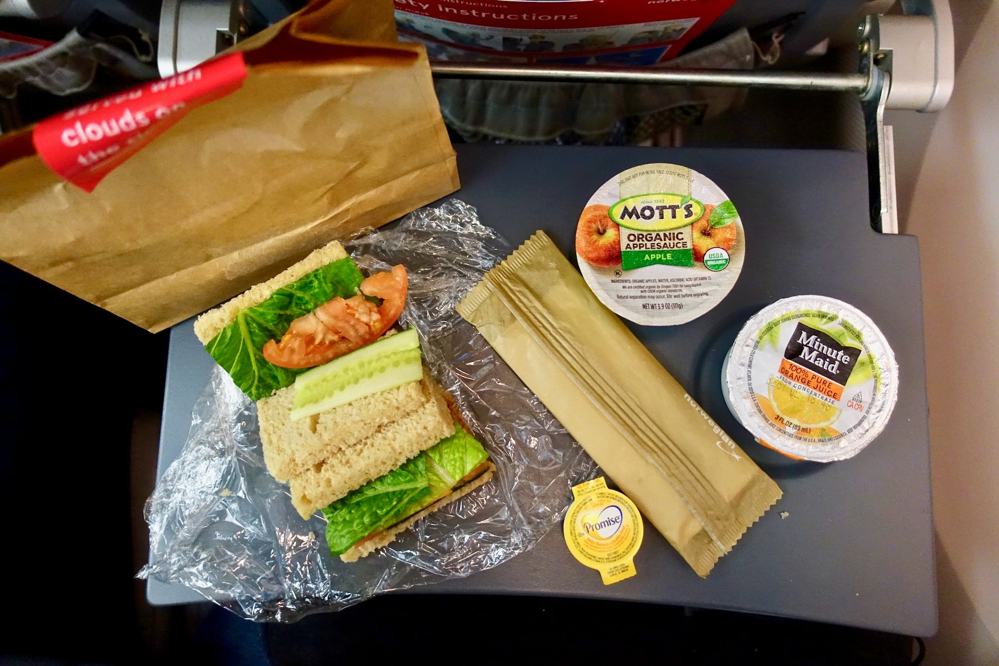 About 90 minutes before landing, I was abruptly woken by the crew putting down my tray table and plopping a brown bag in front of me. Inside was my vegetarian breakfast: a really sad sandwich of lettuce, tomato and cucumber that resembled what was served at Fyre Festival — applesauce, a cup of orange juice and a choice of second beverage. While the sandwich came with a small container of margarine, there was no knife to spread it. I definitely wished that the crew would have let me sleep through this meal.