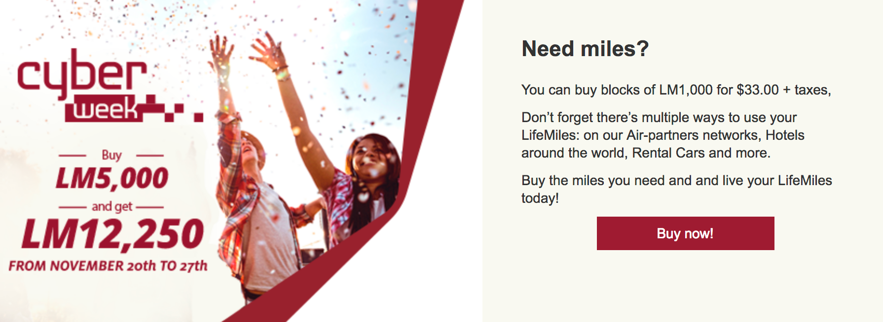 In November, the Citi ThankYou program added Avianca LifeMiles as a transfer partner. So, if you've been looking to redeem for a LifeMiles award, there are now plenty of options to get those miles in your account — between purchasing them with a 145% bonus or transferring them from Citi or SPG. Just remember that if you do indeed want to buy LifeMiles with this 145% bonus, you must do so by November 27.
