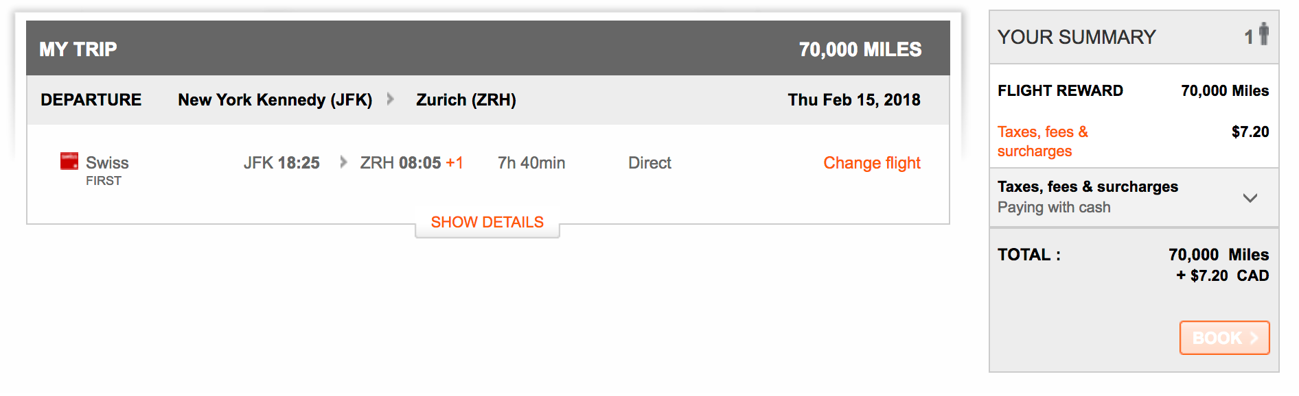 New York (JFK) to Zurich (ZRH) for 70,000 miles + 7.20 CAD one-way in Swiss first: