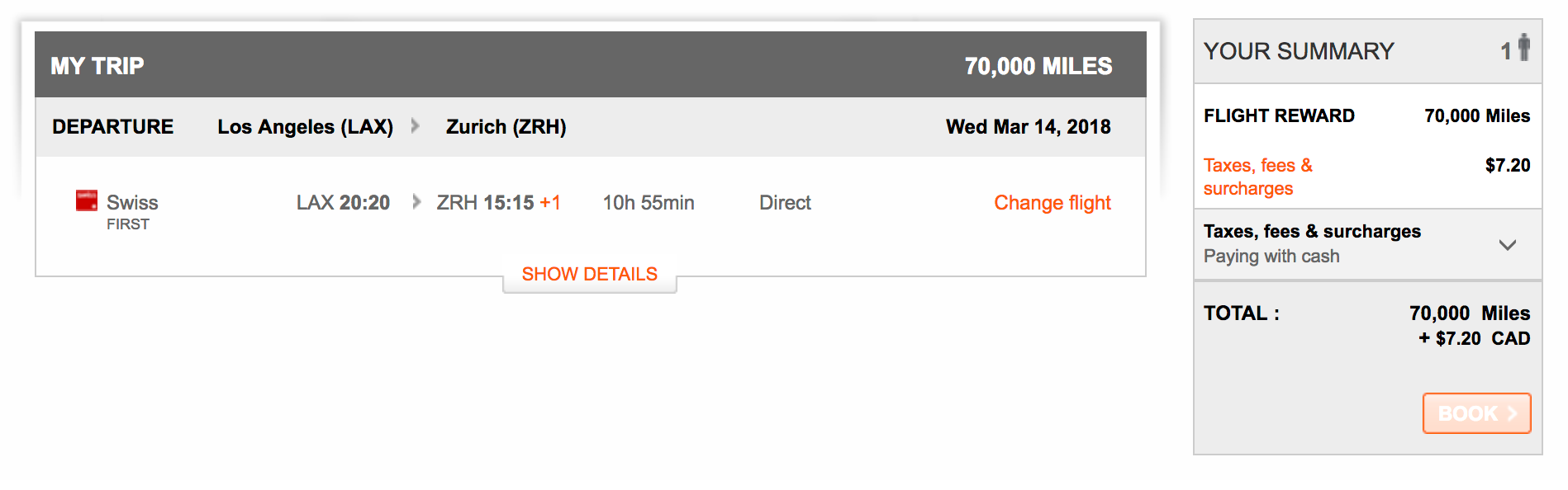 Los Angeles (LAX) to Zurich (ZRH) for 70,000 miles + 7.20 CAD one-way in Swiss first: