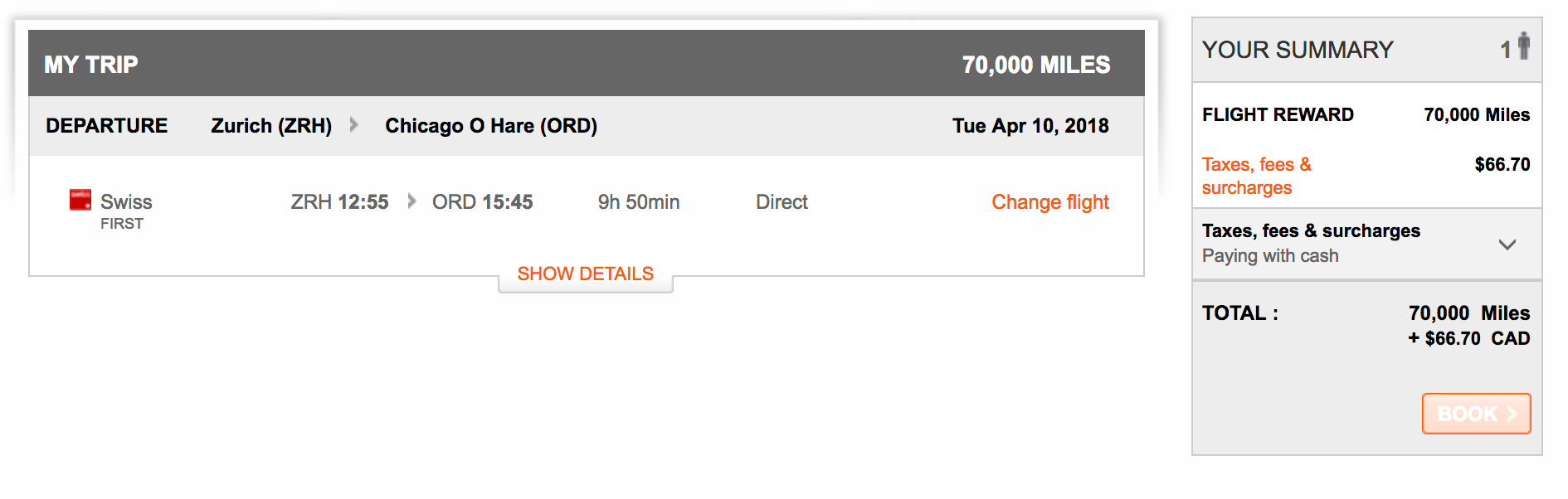 Zurich (ZRH) to Chicago (ORD) for 70,000 miles + 7.20 CAD one-way in Swiss first: