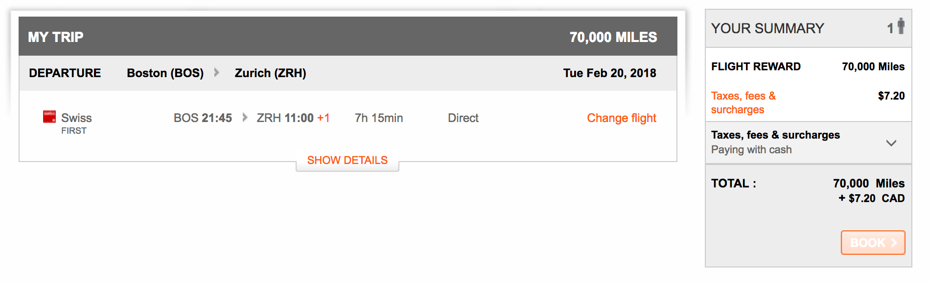 Boston (BOS) to Zurich (ZRH) for 70,000 miles + 7.20 CAD one-way in Swiss first: