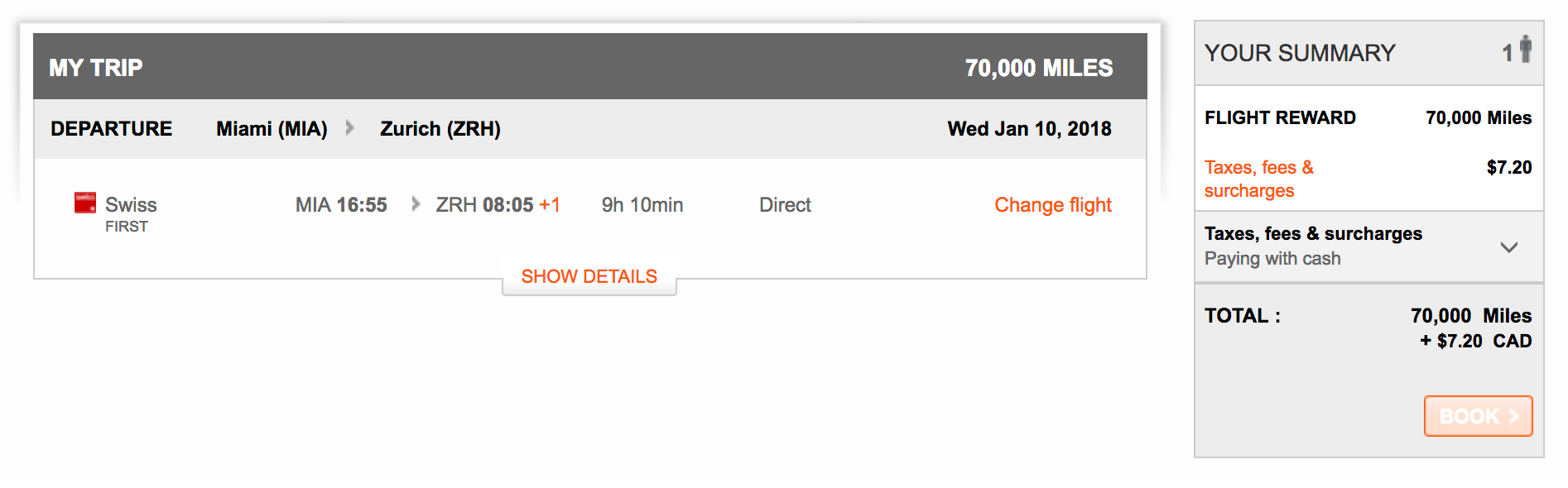 Miami (MIA) to Zurich (ZRH) for 70,000 miles + 7.20 CAD one-way in Swiss first: