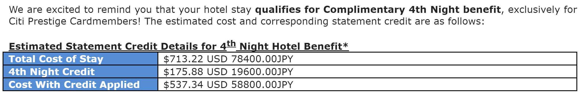 I booked this as a pre-change Citi Prestige 4th-night-free booking over the phone with the Citi concierge, and was able to get the actual cost of the fourth night — including taxes — as a statement credit. Getting the free night eased the sting, but robots still don't come cheap. The total cost for our stay was $178 per night before the 4th Night Free credit and ended up being $134 per night after it.