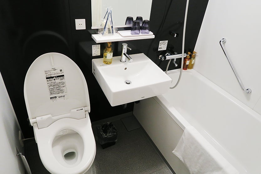 The bathroom was stocked with two new toothbrushes — standard for Japanese hotels — two cups, and Pola Shower Break soap and shampoo. Coffee, tea or any other other bathroom amenities we might've wanted had to be purchased from a vending machine in the lobby.