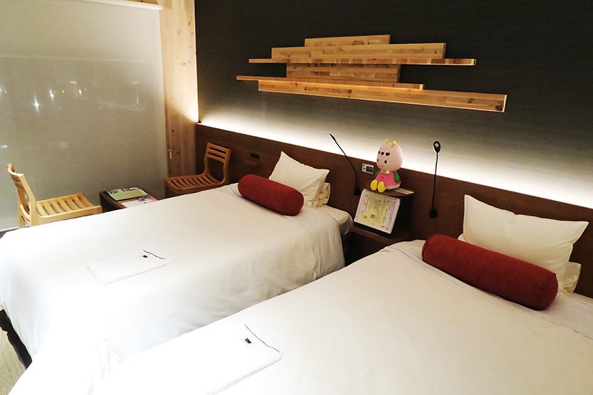 The room was quite small and had little storage — the supposed wardrobe was only a few hangers teetering from a thin wooden plank. That's it. There was no closet, no dressers or any real shelving — only four small vertical cubbies. There was also no desk, but there were two simple wooden chairs and a small side table. The not-quite-full-size beds (48 inches wide by 74 inches long) took up virtually the whole room. We found the beds firm but comfortable. There was only one standard pillow and one long cylindrical pillow per bed.