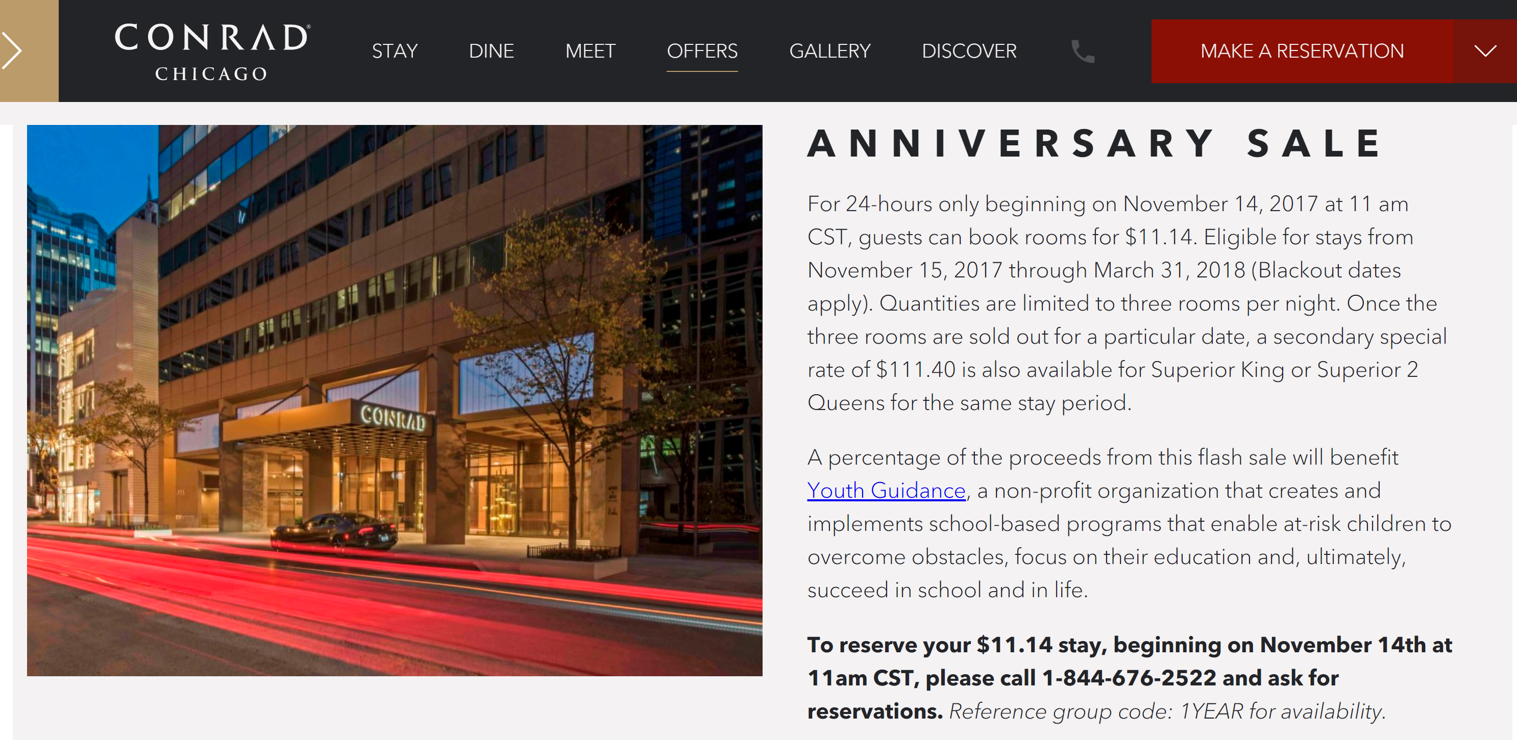 At 11am CT/12pm ET today (November 14), the Conrad Chicago is launching its anniversary special: rooms for just $11.14 per night. But, you better act quickly to get this rate; it'll only be available for 24 hours. And, there's limited availability.