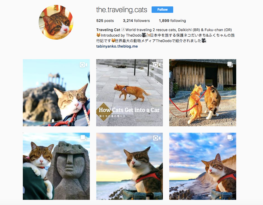 Daikichi and Fuku-chan are two rescue cats who travel the world by backpack, plane, bike, car, hot air balloon — you name it. They're always ready for their close-up and actually seem excited to be captured in a beautiful setting. These fearless cats are the rescue story we love to see: fully enjoying the world and living their best feline lives. Be one of their 3,000+ followers and tag along as they take you on a picturesque journey through Japan.