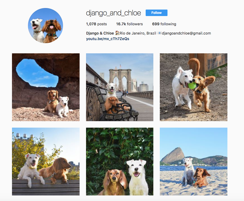 These two pups, Django and Chloe, are inseparable travel buddies. Literally! They haven't spent a day apart since they met five years ago. In-between belly rubs and playing fetch, these furry friends are busy exploring seven countries and counting — and sharing it all on Instagram with more than 16,000 followers.