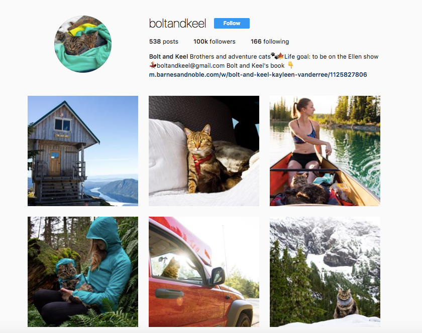 Just like their owners, Kayleen VanderRee and Danielle Gumbley, these two rescue cats named Bolt and Keel love nothing more than exploring the outdoors. Cat lovers won't be able to resist after catching a glimpse of these outdoor cat-thusiasts who love sailing, canoeing, kayaking and hiking around Canada. If IG isn't enough, you can also keep track of their adventures on their YouTube page @Bolt and Keel.