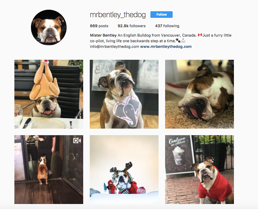 This globetrotting English bulldog from Vancouver, Canada is the greatest co-pilot anyone could ask for. His owner, Brad Friesen, is a helicopter pilot, so Mr. Bentley gets to travel around putting smiles on faces everywhere. Take a look at his Instagram and you'll see he's the best-dressed pup around — often wearing costumes or a jacket to stay warm; and if you get the chance to meet him, don't be surprised if he's walking backwards: This is just how Mr. Bentley likes to stroll. Nothing better than following a backward-walking, high-flying bulldog.