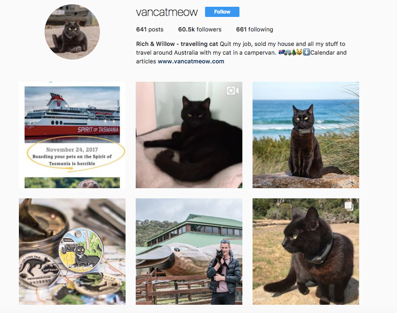 Willow is one lucky cat: For the past three years, she has been traveling around Australia with her owner, Rich, in a campervan. She is a rescue cat can often be found posing for the camera — that is, when she's not taking a snooze. She loves treats and will do anything for a snack and some catnip. It's clear that she's dedicated to Rich and their travels around Australia together bind them together for life. After Willow was rescued, it became clear that they'll never leave each others side.