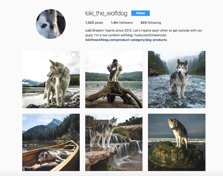 With an astounding 1.6 million followers, Loki is a husky/arctic wolf/malamute mix that lives in Colorado with his owner, Kelly Lund. Lund started this page for his Loki when he was just four months old. Since then, the two have set out to inspire others to get out, explore their world and make memories with their pups. Find stunning pictures of Loki in breathtaking locations — from the Elk Mountains of Colorado to the rivers in California — on his page.