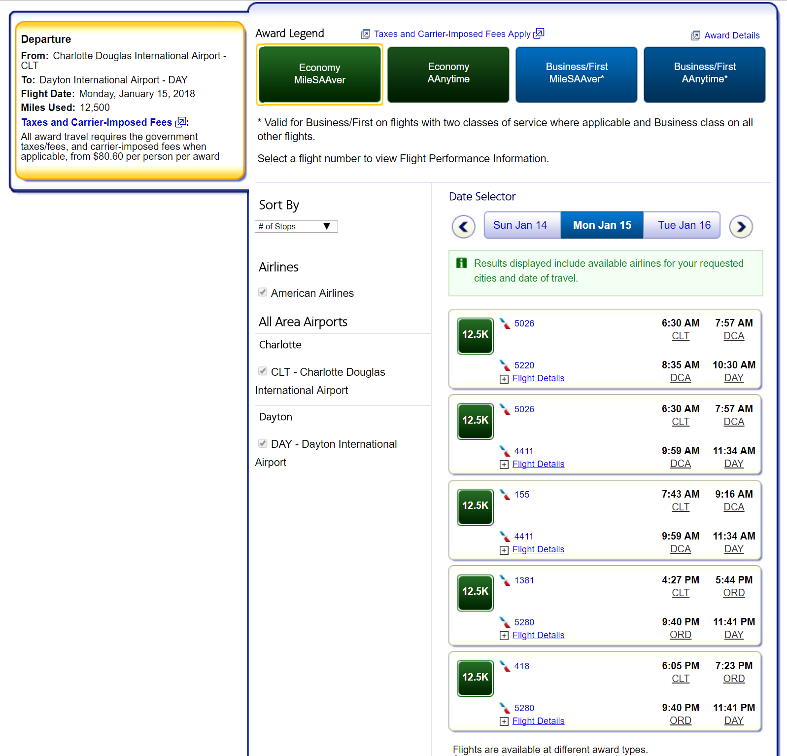 One of those two-stop options utilizes an American Eagle flight from Charlotte (CLT) to Dayton (DAY). How about if you wanted to book that nonstop leg separately? Again, there's no availability on that flight by itself. But, you have the option of connecting in Washington, DC or Chicago: