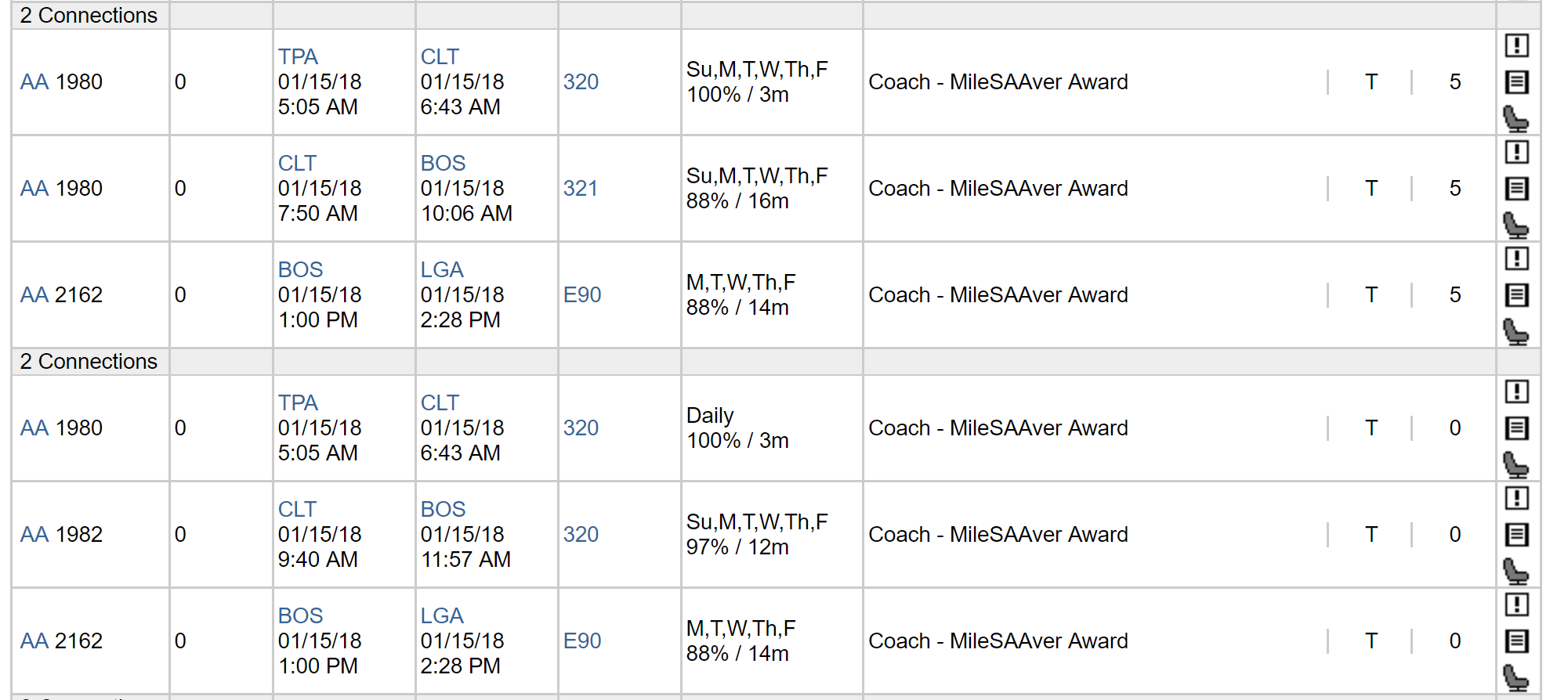 The impact of this change causes some wild results. You can have the exact same first (TPA-CLT) and last (BOS-LGA) flight, but the connecting flight is the deciding factor in award availability:
