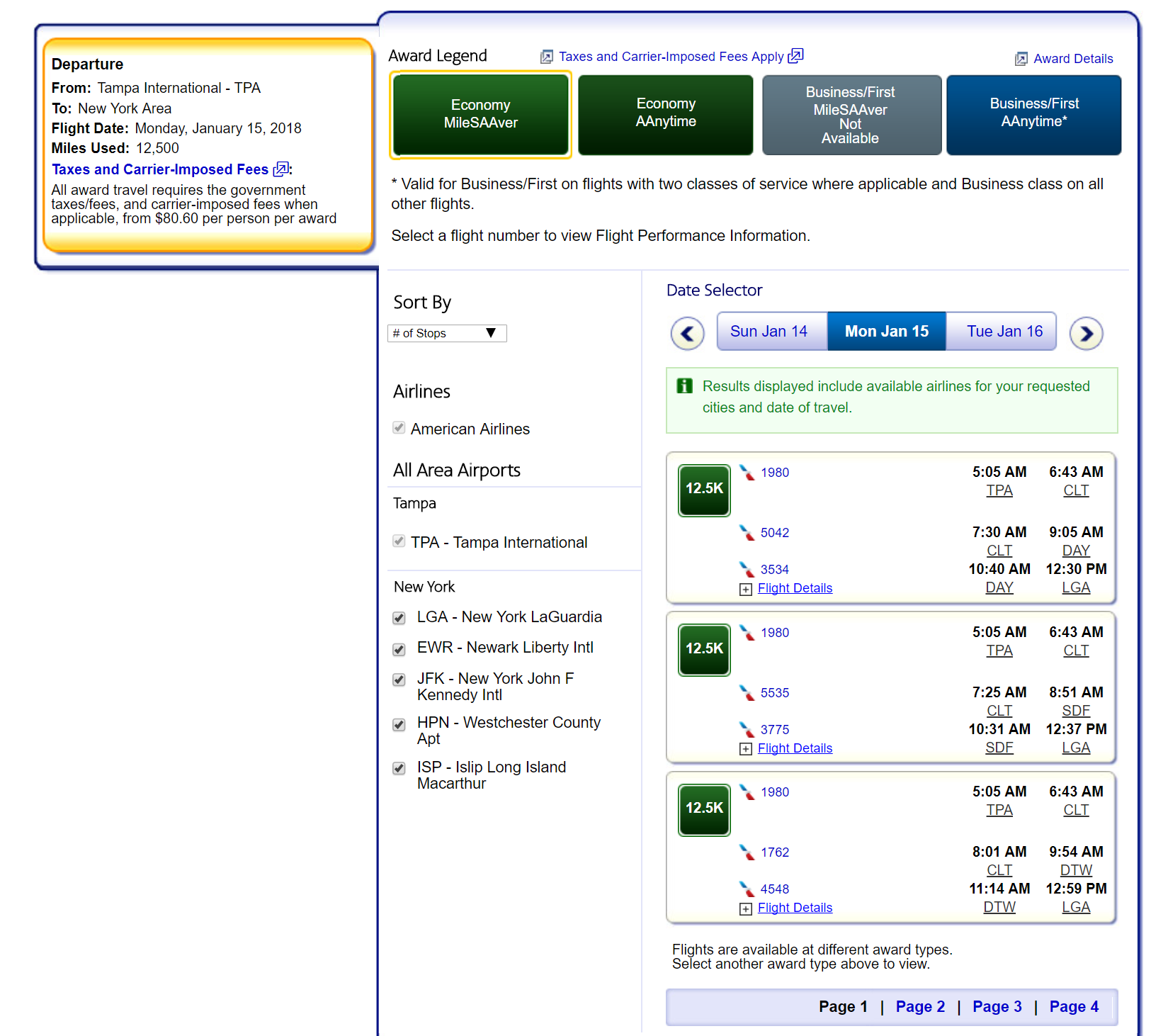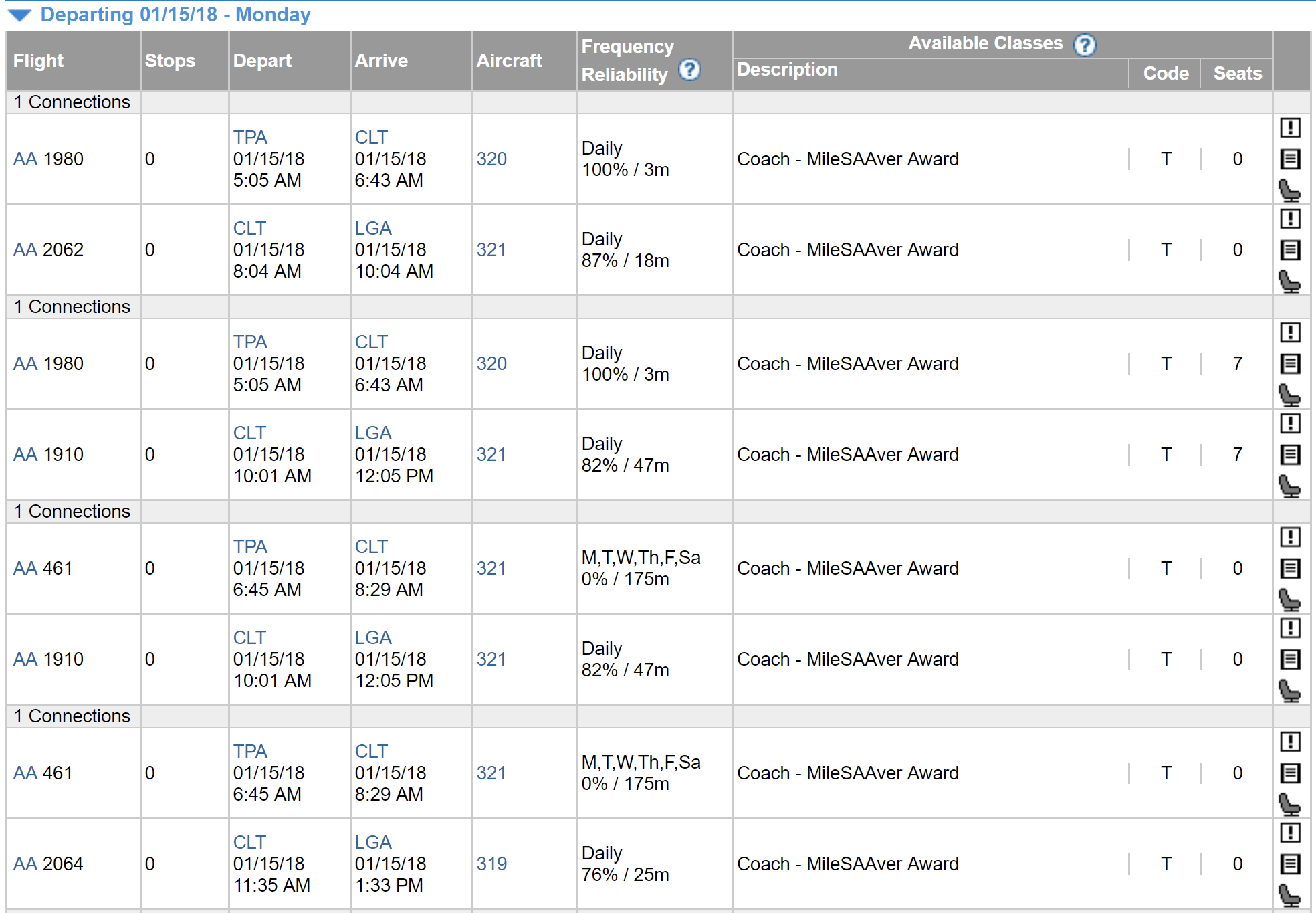 Although AA doesn't have any nonstops between Tampa (TPA) and NYC (JFK/LGA/EWR), AA currently has 123 different one-stop itineraries for sale on this route for January 15. However, there currently isn't a single award option on any of these one-stop options.