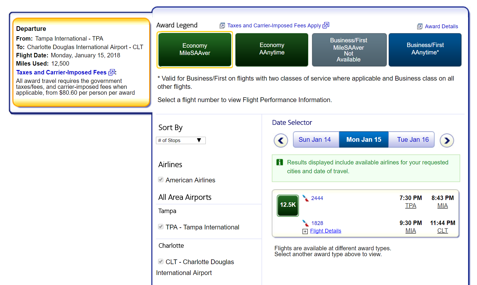 But, how about flight #1980 from TPA to CLT? That flight shows up for all three itineraries above, so there must be a lot of award availability on that early morning flight. So, someone looking to fly from Tampa to Charlotte should easily be able to book that flight with miles, right? Wrong. If you want to fly from Tampa to Charlotte that day, the only option is to connect through Miami (MIA) instead.