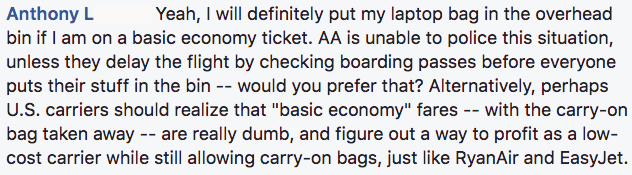 Many commenters had the same question as Shane D. There's confusion because regular economy passengers board before BE flyers, and thus there shouldn't be an issue with filled overhead bins. However, even AA elites are finding that BE passengers are using the bins to store their luggage, leaving less room for those who paid more for Main Cabin tickets.