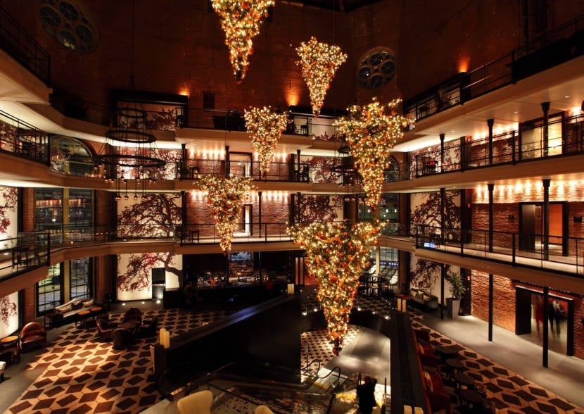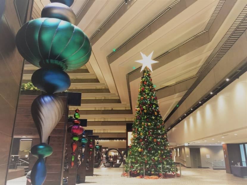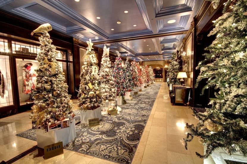 The Hyatt Regency in San Francisco takes advantage of every inch of a 17-story open atrium when the holidays roll around. At the center of it all stands a 30-foot-tall Christmas tree; the gigantic eclipse sculpture shines bright with red and green lights and giant ornaments hang all around the lobby. And while SF doesn't get much snow, that doesn't stop the Hyatt from dazzling in a winter wonderland; snow falls inside the lobby at least three times a day. The hotel also features an ice skating rink put on by Hawaiian Airlines. And, of course, Santa Claus makes an appearance as Christmas approaches.