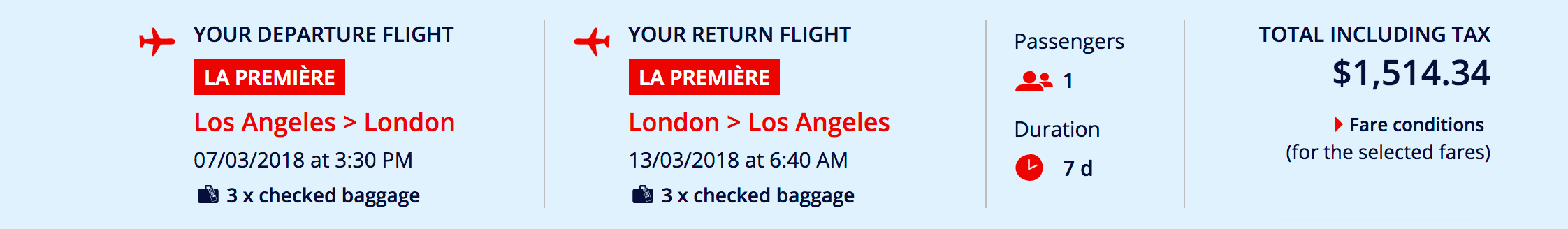 Los Angeles (LAX) to London (LHR) for $1,514 round-trip in La Première: