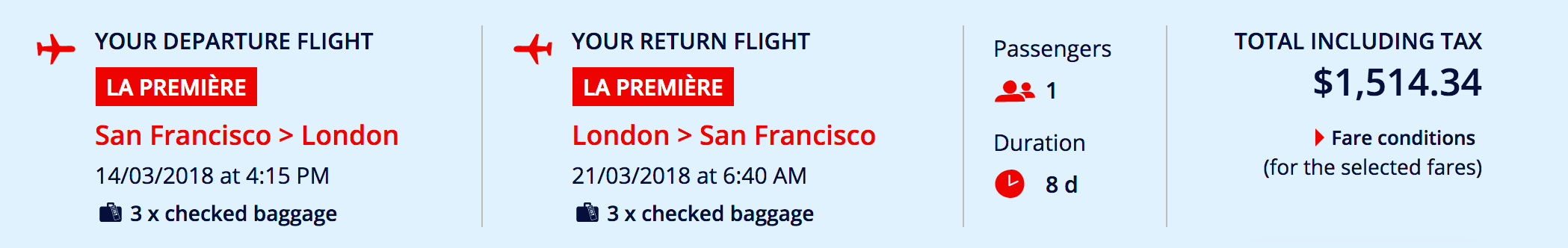 San Francisco (SFO) to London (LHR) for $1,514 round-trip in La Première: