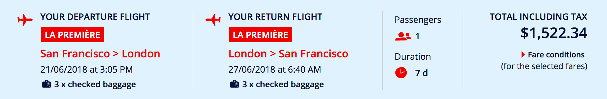 San Francisco (SFO) to London (LHR) for $1,522 round-trip in La Première: