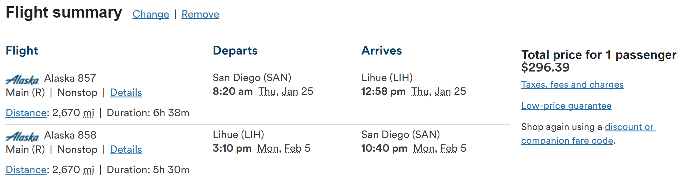 San Diego (SAN) to Lihue (LIH) for $296 round-trip nonstop: