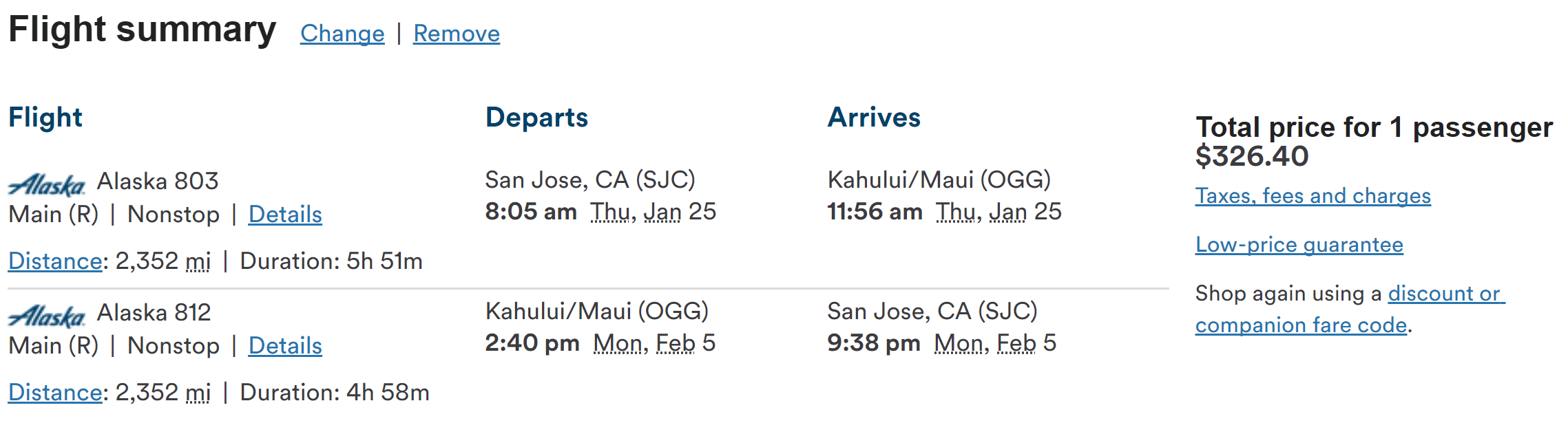 San Jose (SJC) to Kahului (OGG) for $326 round-trip nonstop: