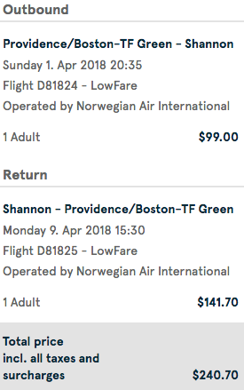 Providence (PVD) to Shannon (SNN) in April for $241 round-trip: