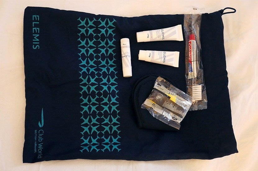 The amenity kit included the usual offerings — eye mask and earplugs, lip balm, moisturizer, dental care kit and other Elemis goodies.