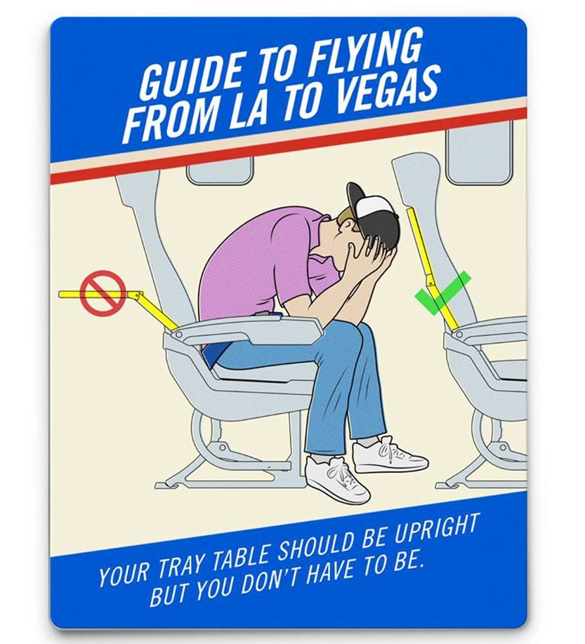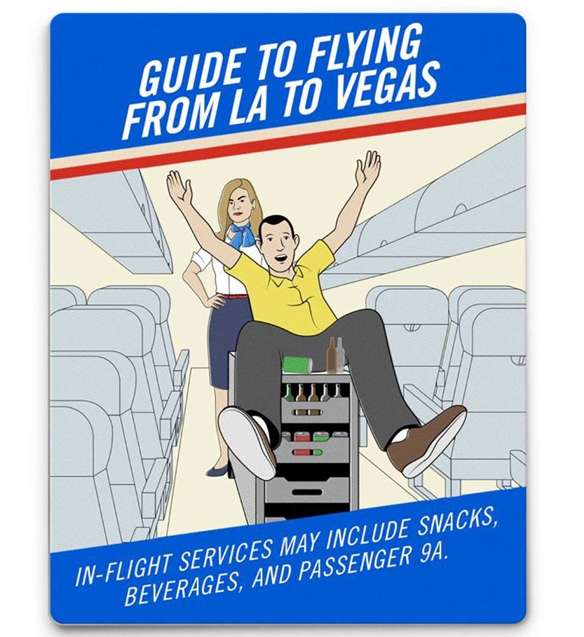 On the flight out, passengers are riding high, shouting "Vegas! Vegas! Vegas!" A quick 10 seconds reveal exactly how a weekend in Las Vegas works — EDM clubs, slots, tequila, blackjack. Suddenly, you're back at McCarran International (LAS), desperate to be home and hear: "Bad news, everybody. Flight 1322 will be delayed at least another hour." (Been there.)