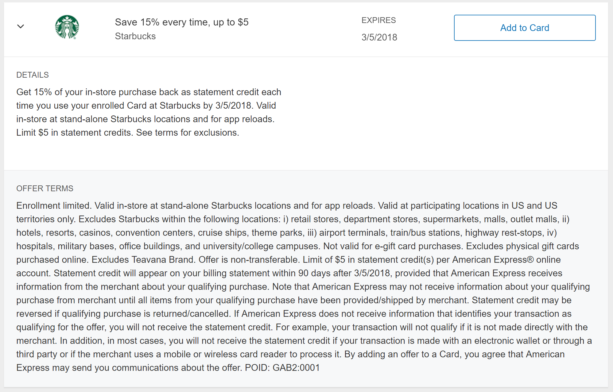 Today, a valuable new Amex Offer just posted to certain American Express credit card accounts, for 15% off Starbucks purchases on eligible Amex cards now through March 5: