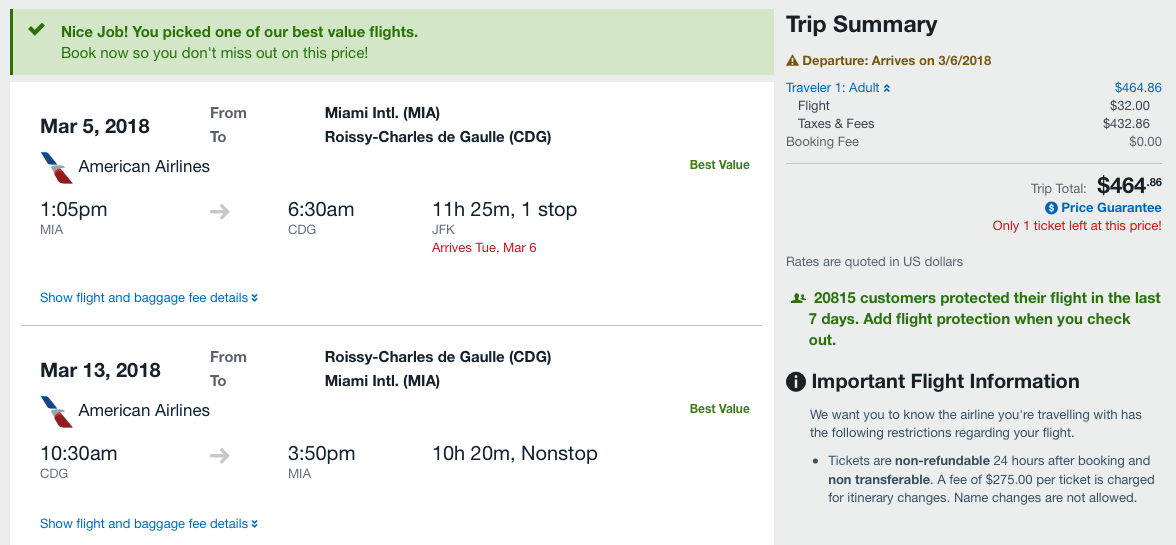 Miami (MIA) to Paris (CDG) for $465 round-trip via Orbitz: