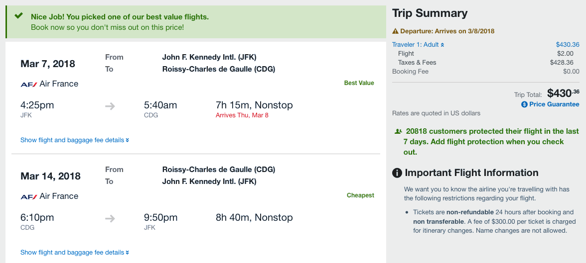 New York (JFK) to Paris, France (CDG) for $430 round-trip via Orbitz: