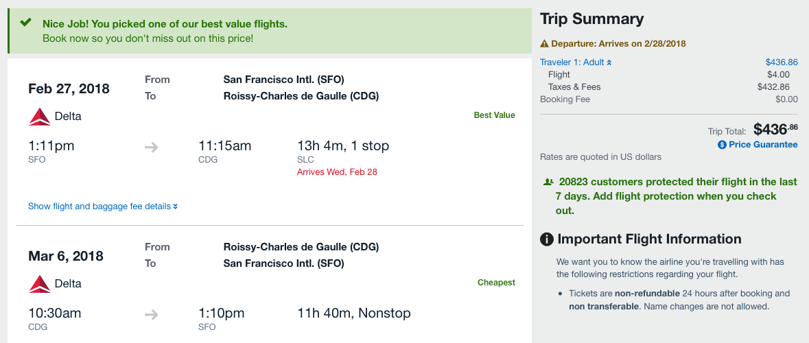 San Francisco (SFO) to Paris (CDG) for $437 round-trip via Orbitz: