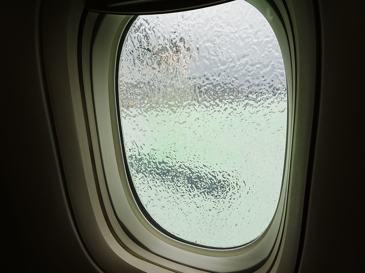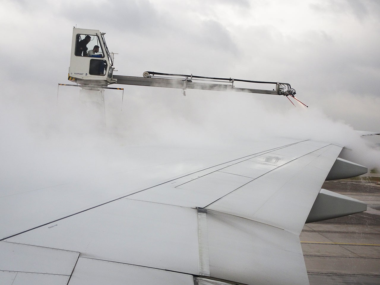 Flight attendants (I was told "about 14" work this flight) were professional and efficient and communication from the flight deck (in German, then English) was very good. With a scheduled departure of 1:10pm, at 1:05, the captain announced we were waiting for connecting passengers but also, due to snow, we would have to de-ice, which would "take some time." He expected to be airborne in "about half an hour." Boarding was completed at 1:15 and we pulled from the gate at 1:18.At 1:25, we pulled into the de-icing area where I slid into a window seat to watch a thorough bath with de-icing fluid.