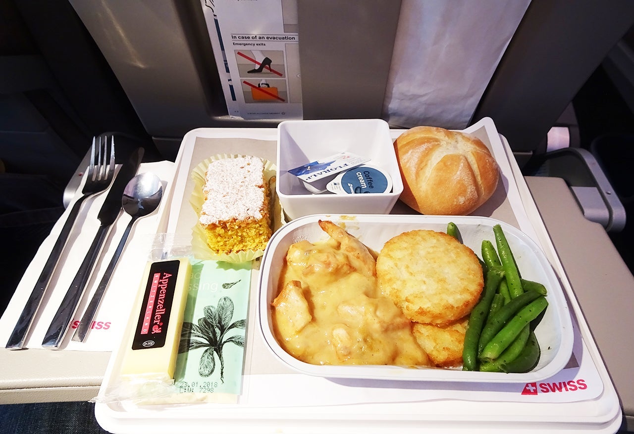 Food and drink service started quickly and continued at a good pace. Fewer than 20 minutes after wheels up, a small packet of rosemary mini-breadsticks arrived with a choice of complimentary drinks. They were cleared 15 minutes later and a popup on my screen showed the meal choice: chicken or vegetarian pasta. I chose the "Chicken Zurich Style" — Zuerigschnetzlets, in the Swiss dialect of German — with hash browns and beans, and apparently "Zurich Style" means microwaved and drenched in bland sauce.