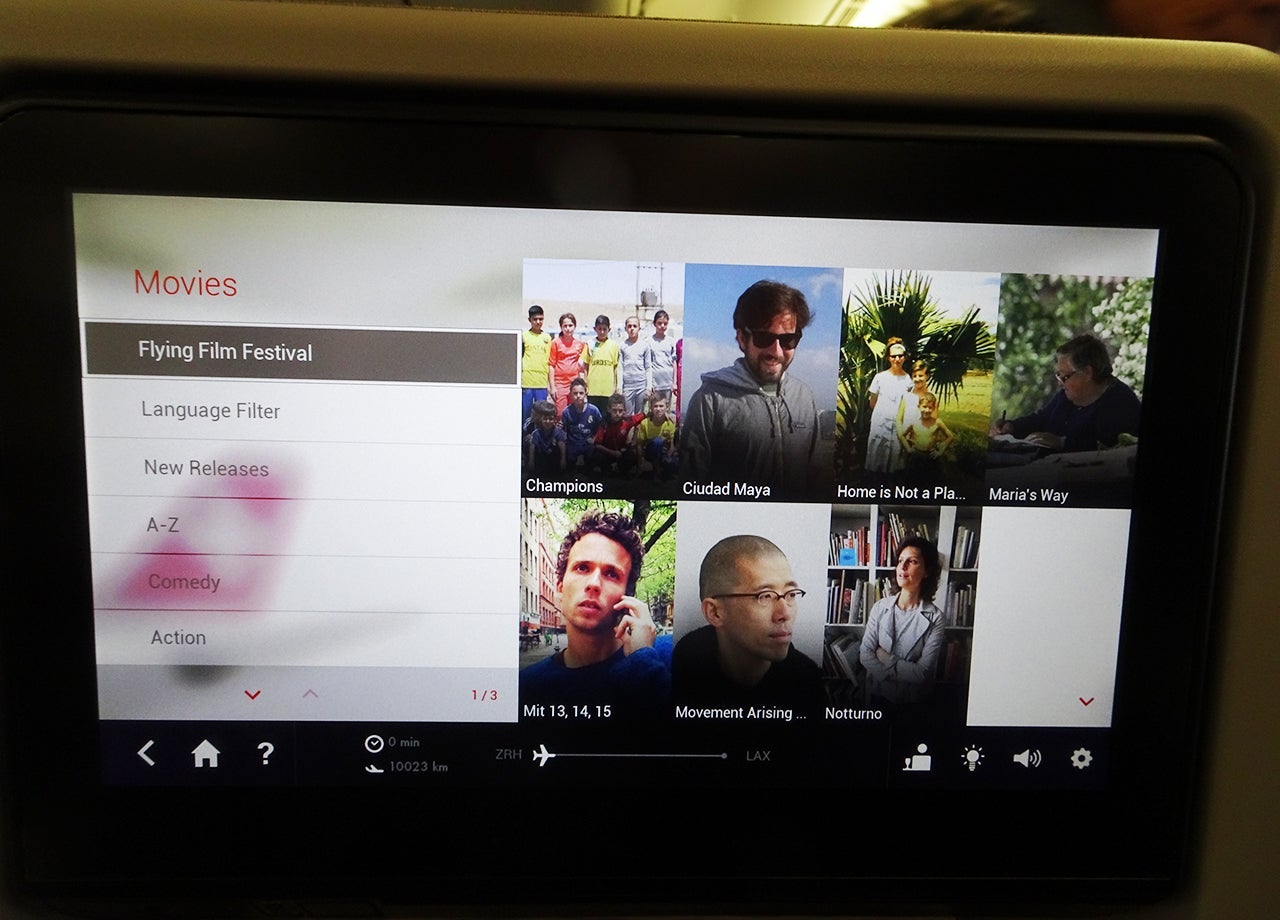 The system offered a very international selection of movies, with some reasonably recent releases, organized well and including a "Made in Switzerland" section and a "Flying Film Festival." Audio offerings included music, audiobooks and podcasts.