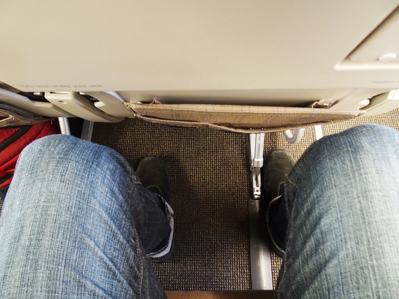 Legroom was decent, and though my knees were closer to the seatback than I would've liked, I was angled so the squeeze didn't feel as bad as it looked. The recline was excellent and actually made me comfortable (in Economy!), especially when combined with the fine-tuned adjustability of the headrest. The space underneath the seats wasn't as well-designed. For some reason, the space was asymmetrical — essentially three under-seat spaces for the four seats, with dividers that don't match up with each seat. This could lead to some awkward placement of bags and feet on a crowded flight, but gladly that wasn't an issue on this one. The roomy seat pocket had two small compartments on its front and an external cup holder.