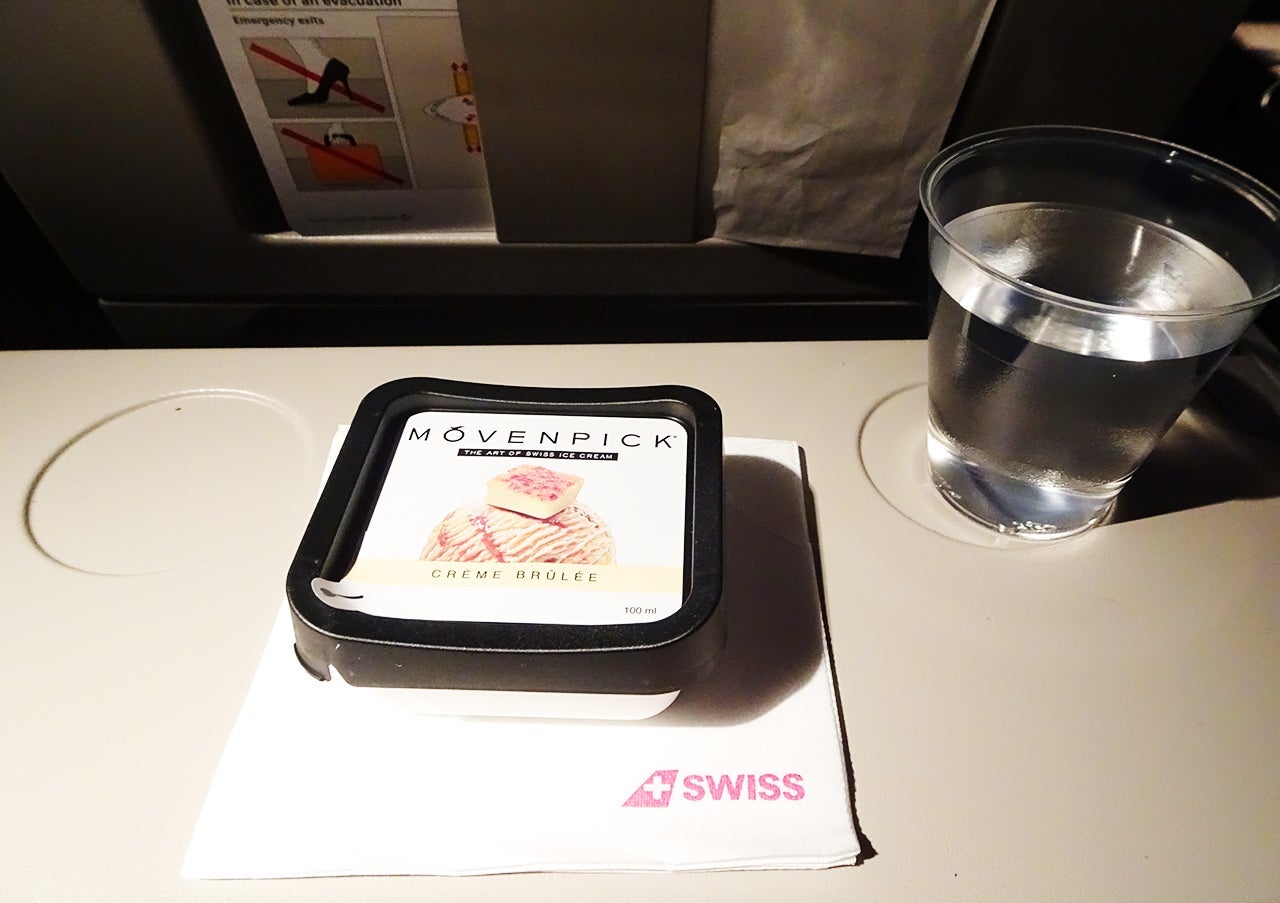 I also spotted asparagus soup packets, but no spoons or hot water. A flight attendant was happy to get them for me when I asked, and I was happy to have the soup — more flights through cold weather should offer this. Four hours after dinner had been cleared, a serving of Mövenpick ice cream arrived. I would have liked it sooner and colder, but free ice cream is free ice cream.