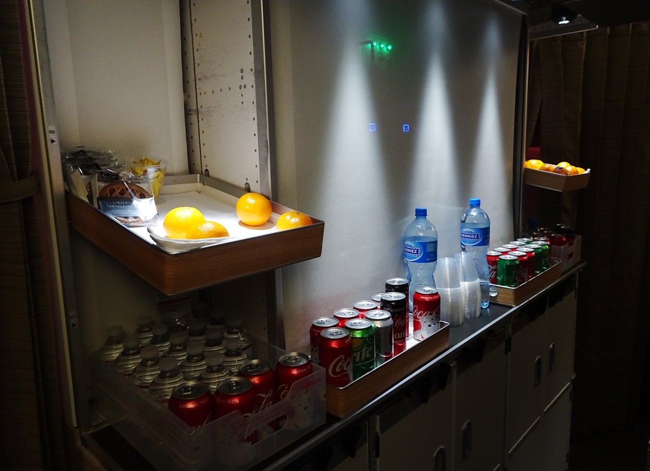 While this was not an awful meal, it was not good, and much of it was left on the tray which was cleared 30 minutes later. Lights dimmed within the hour but food and drink options remained available. Oranges, candy, tarts and soft drinks (three brands of bottled water!) remained within easy grasp in the galleys and were later joined by sandwiches.