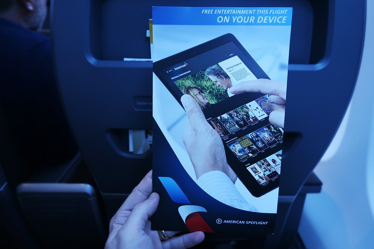 AA's 737 MAX aircraft infamously don't have in-flight entertainment screens. Instead, the airline directs flyers to stream entertainment to their personal devices. In economy, AA has installed personal device holders.