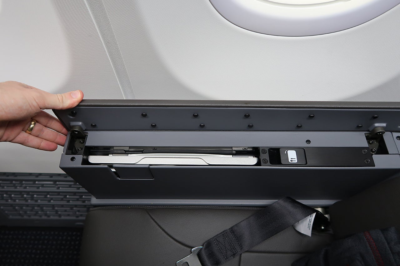 The intelligently designed tray tables stow in the outside armrests (on the aisle and window). The bi-fold tray table measures 19 inches wide by 10.5 inches deep when fully extended. The only trick to this tray table is that you've got to pull the lever behind the stored tray to release it, which I watched a fellow passenger learn the hard way after unsuccessfully struggling to pull the table out.
