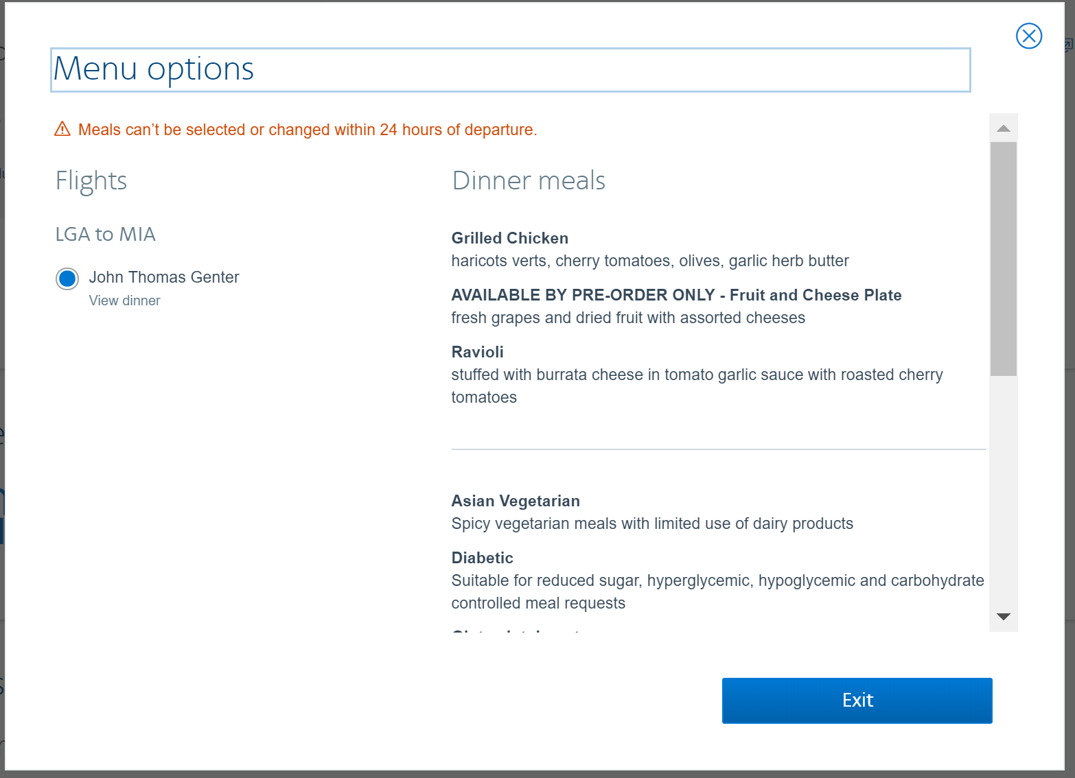On-board, dinner options were summarized as "pasta or chicken." However, longer descriptions were available online before the flight. Since I booked within 24 hours, I was unable to pre-order my meal, but I saw the meal descriptions: