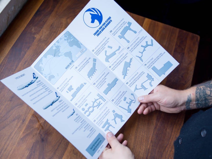 Riffing on in-flight information cards, TD Airways has a tri-fold menu with illustrations by Peter Gamlen and features plane model diagrams, international terminal maps and business class selections for those who like upgrades. (Proceeds from the sale of the menu itself benefit Seven Tepees Youth Programs, Trick Dog's long-time non-profit partner.)