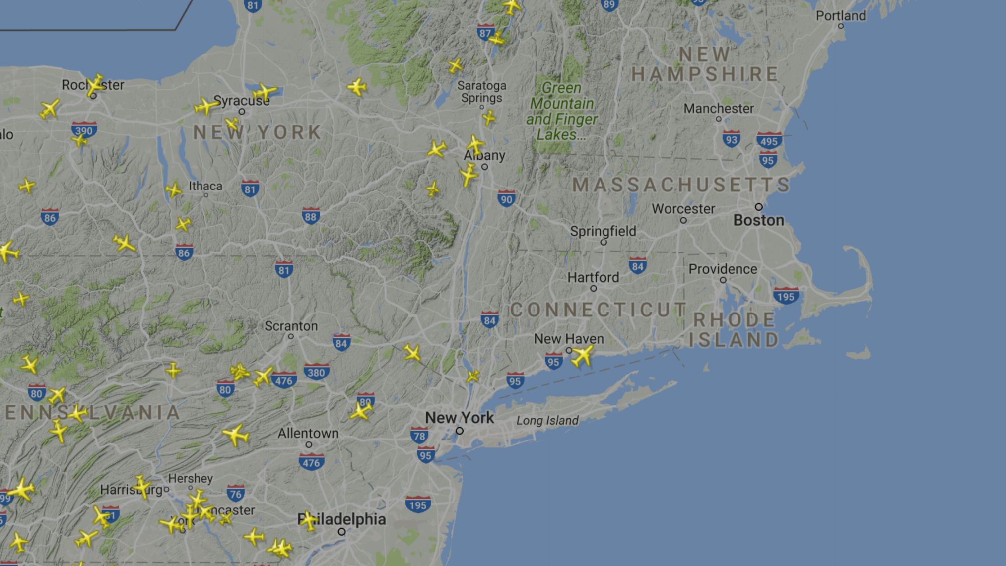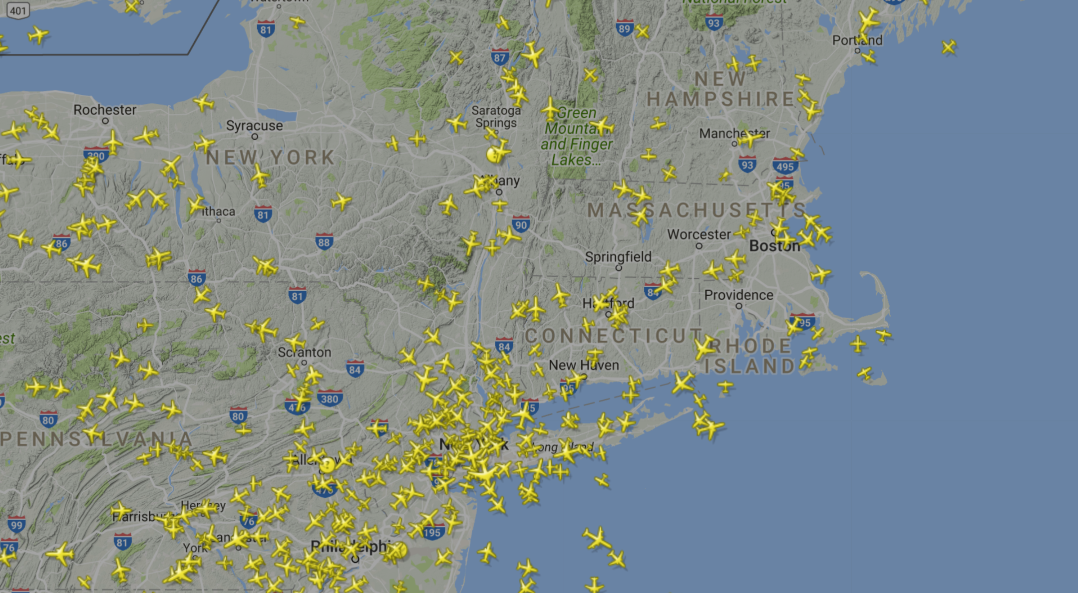 That's a solid amount of air traffic for midday and mid-week after the holiday rush has subsided. There are clear hubs of activity around New York City's three airports (JFK/LGA/EWR), Philadelphia (PHL) and Boston (BOS), with transiting traffic making its way through the area.