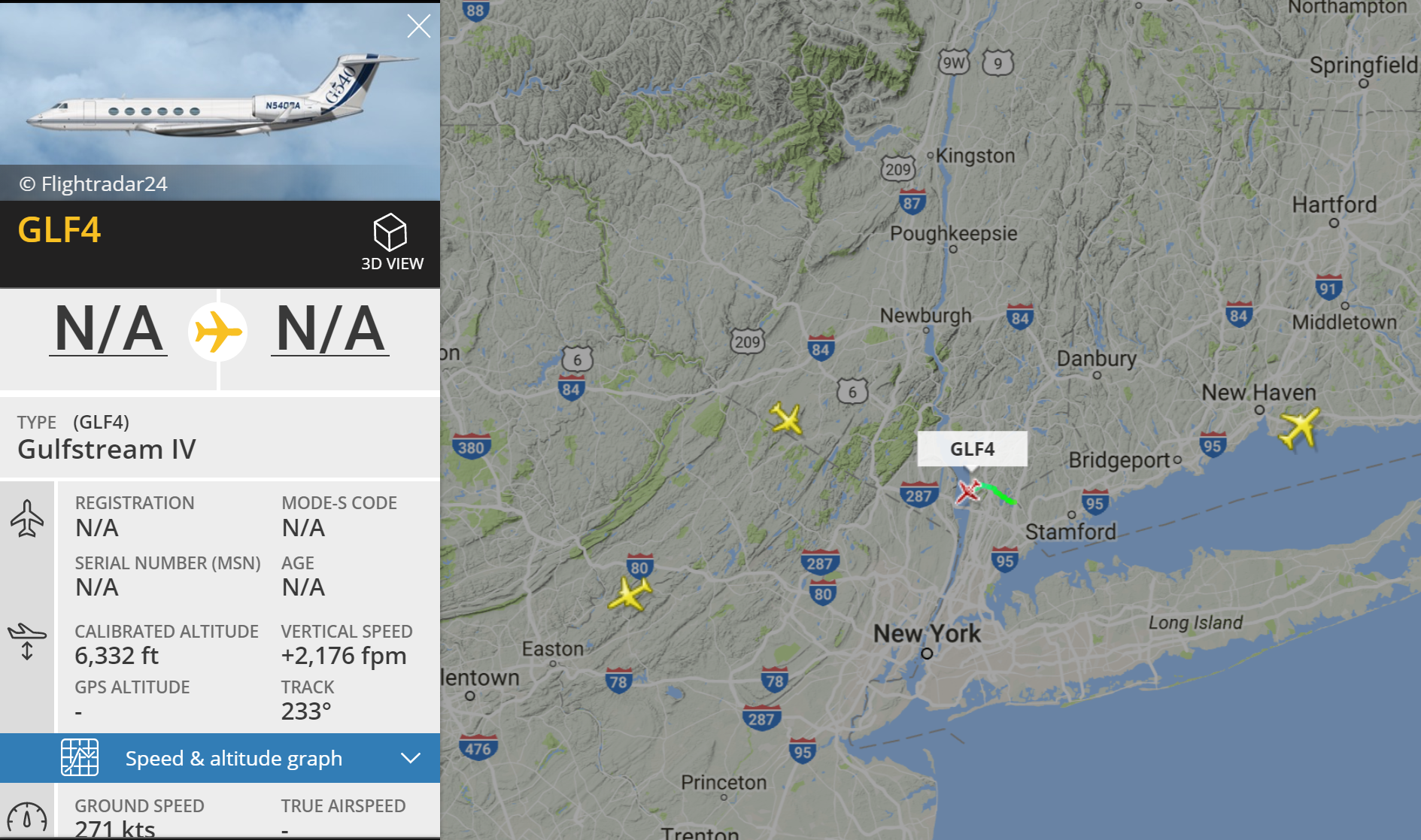 The small plane just north of NYC is a Gulfstream IV which departed out of Westchester County Airport (HPN), a private jet perhaps carrying passengers who absolutely, positively needed to get somewhere despite the storm.